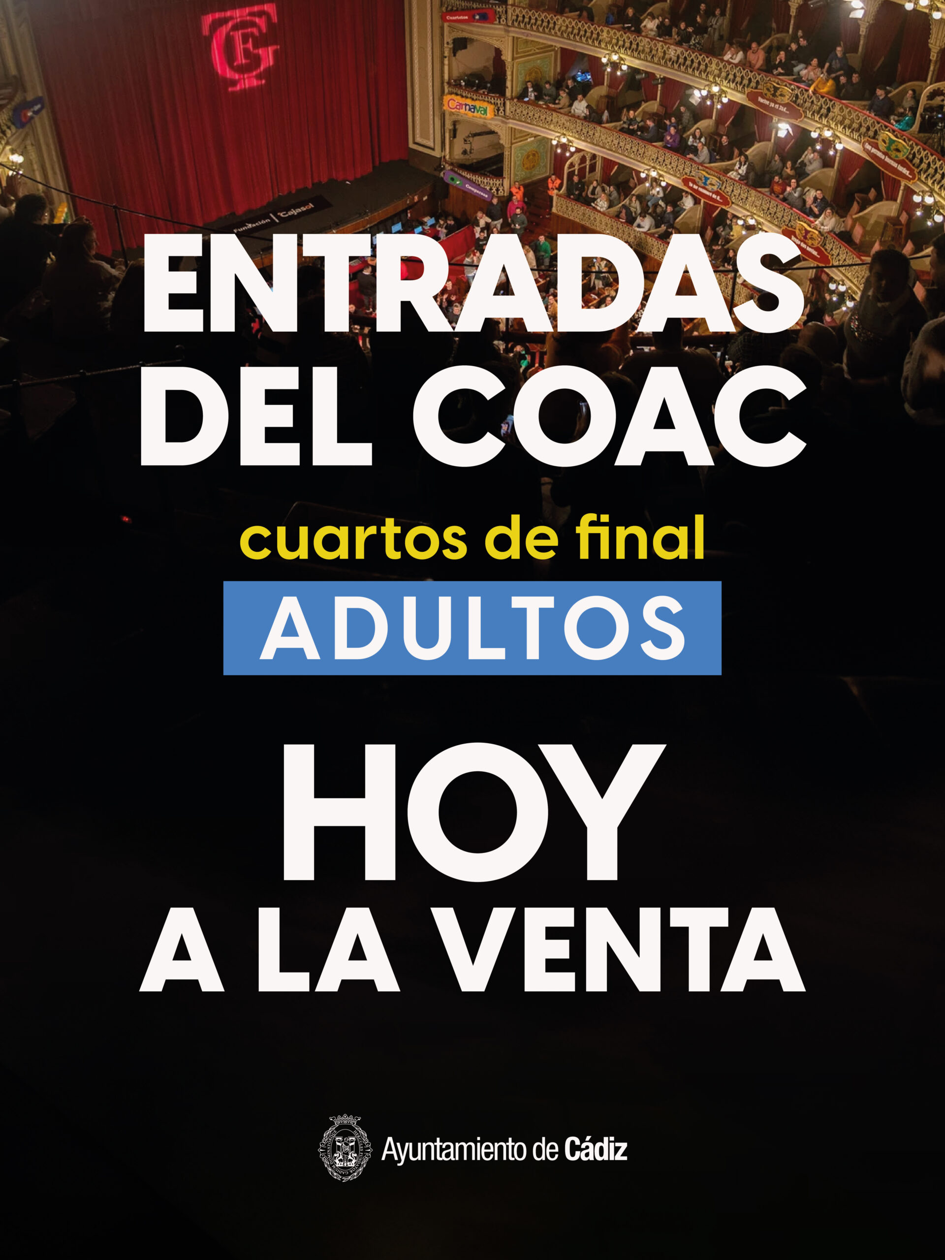Las entradas para los cuartos de final del #COAC2026 salen hoy sábado a la venta en taquilla, priorizando al público gaditano #Cádiz. Desde las 10 horas en el Ayuntamiento de Cádiz.