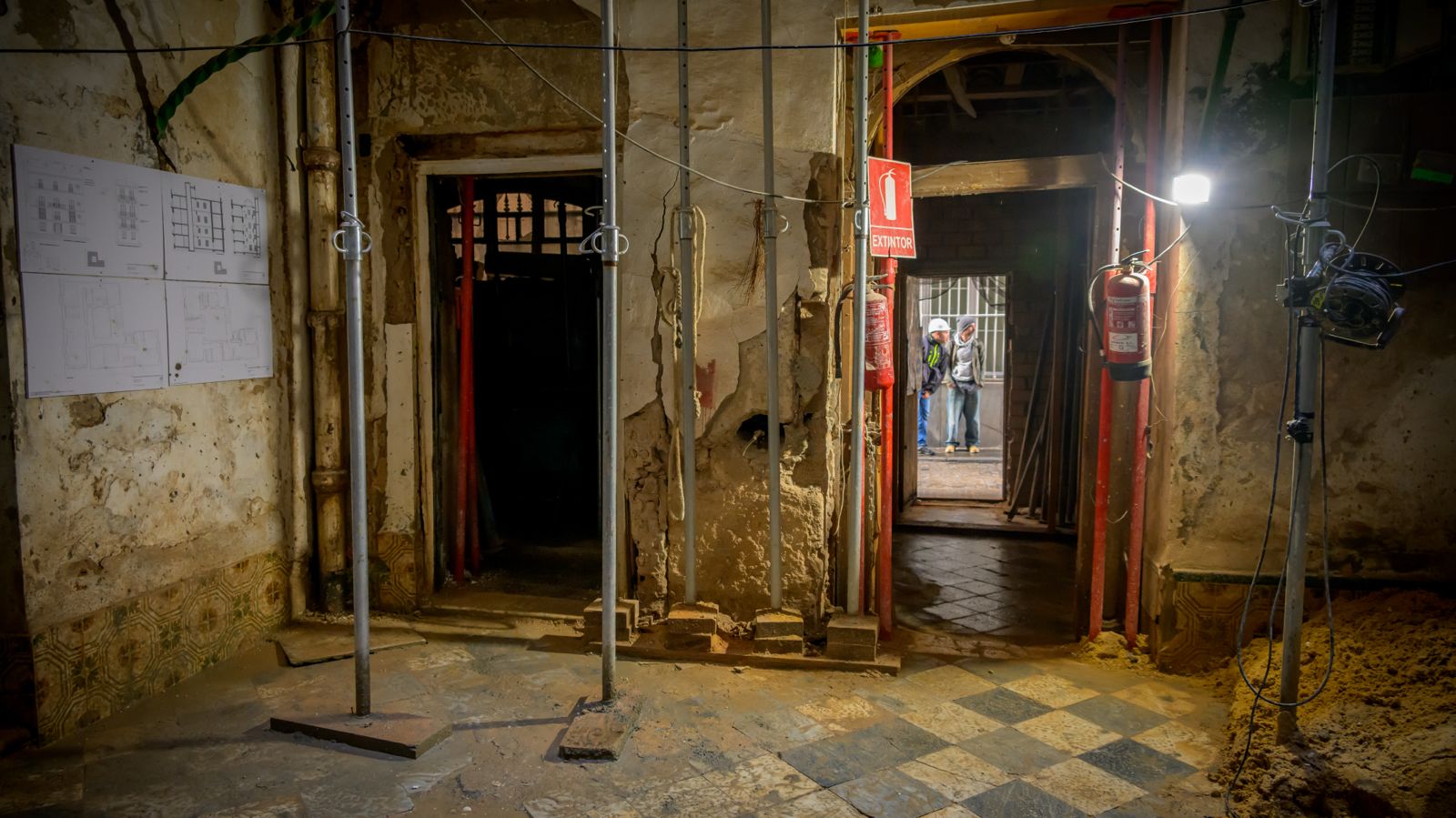 Desde el inicio de la obra se han efectuado los trabajos previos de limpieza, desratización, control de pagas, retirada de mobiliario, instalaciones y equipos que aún quedaban en el edificio, adoptándose a su vez medidas preventivas como el apuntalamiento de la finca, especialmente en la zona de las galerías.